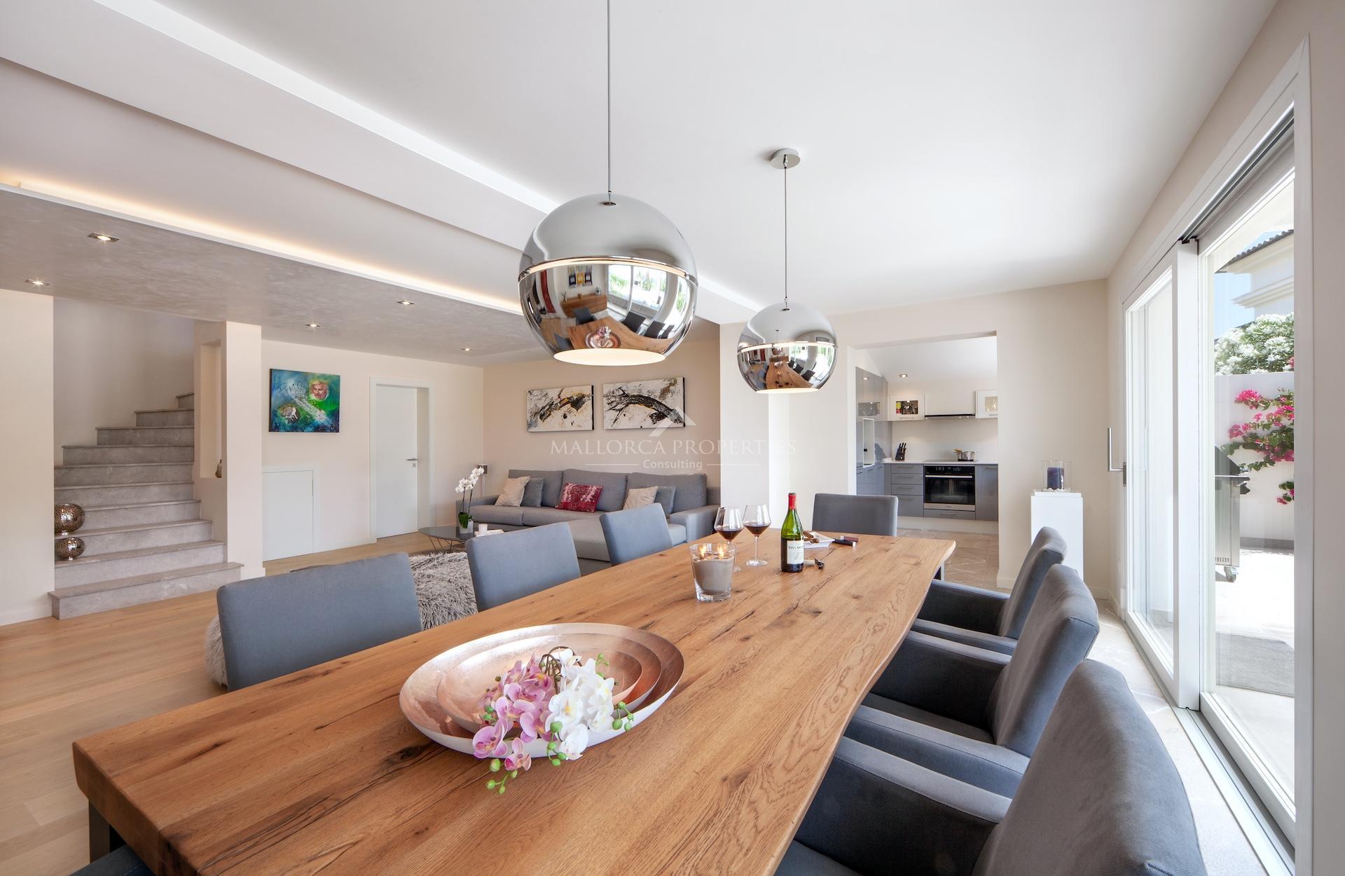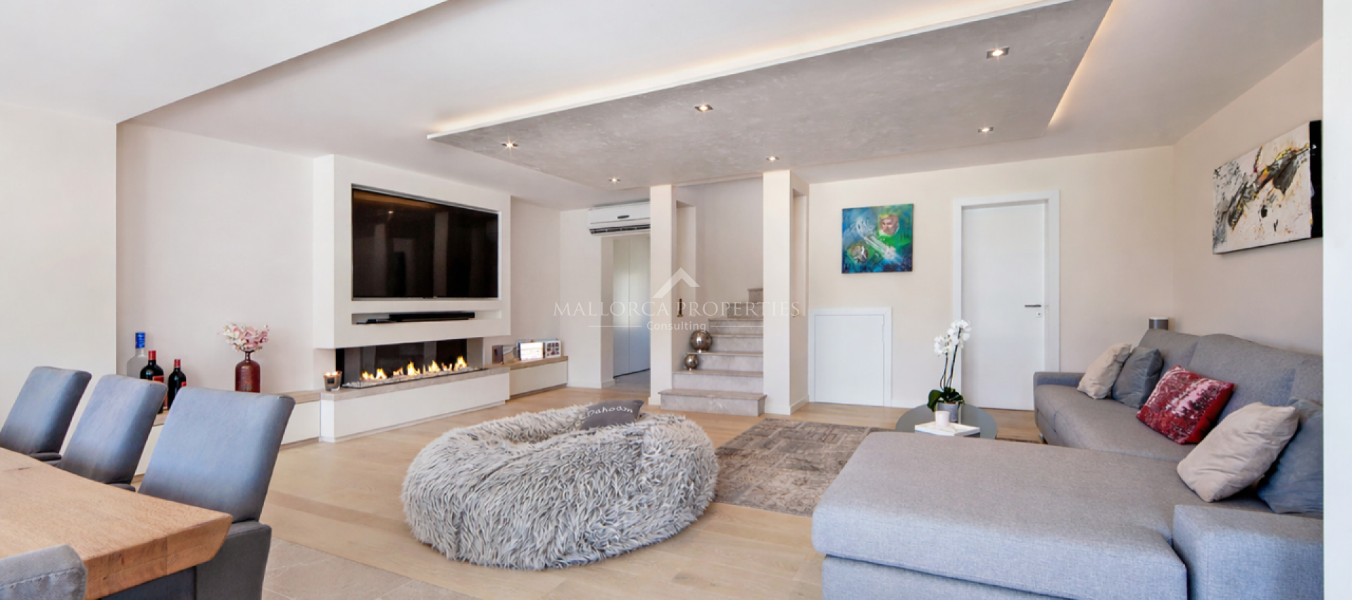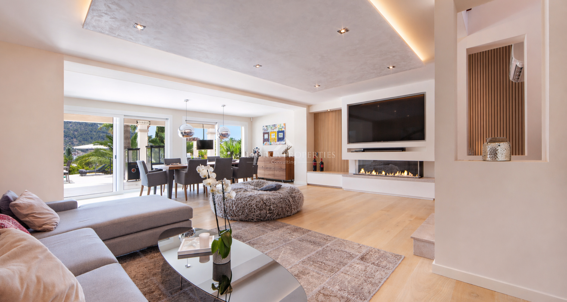 Die Immobilie verfügt über einen hellen und großzügigen offenen Wohn- und Essbereich, der in eine elegante, voll ausgestattete Küche mit separatem Hauswirtschaftsraum übergeht. Drei geschmackvoll eingerichtete Schlafzimmer, zwei elegante Badezimmer sowie ein zusätzliches Gäste-WC vervollständigen das Raumangebot. Das Hauptschlafzimmer bietet einen wunderschönen Blick auf das Meer und den Hafen. Im Innenbereich wurde die Finca vollständig in einem modernen, zeitlosen Stil renoviert, mit großzügigen offenen Wohnbereichen, die fließend in die Außenbereiche übergehen. Hochwertige, maßgefertigte Tischlerarbeiten aus Österreich verleihen dem gesamten Haus eine exklusive Note.