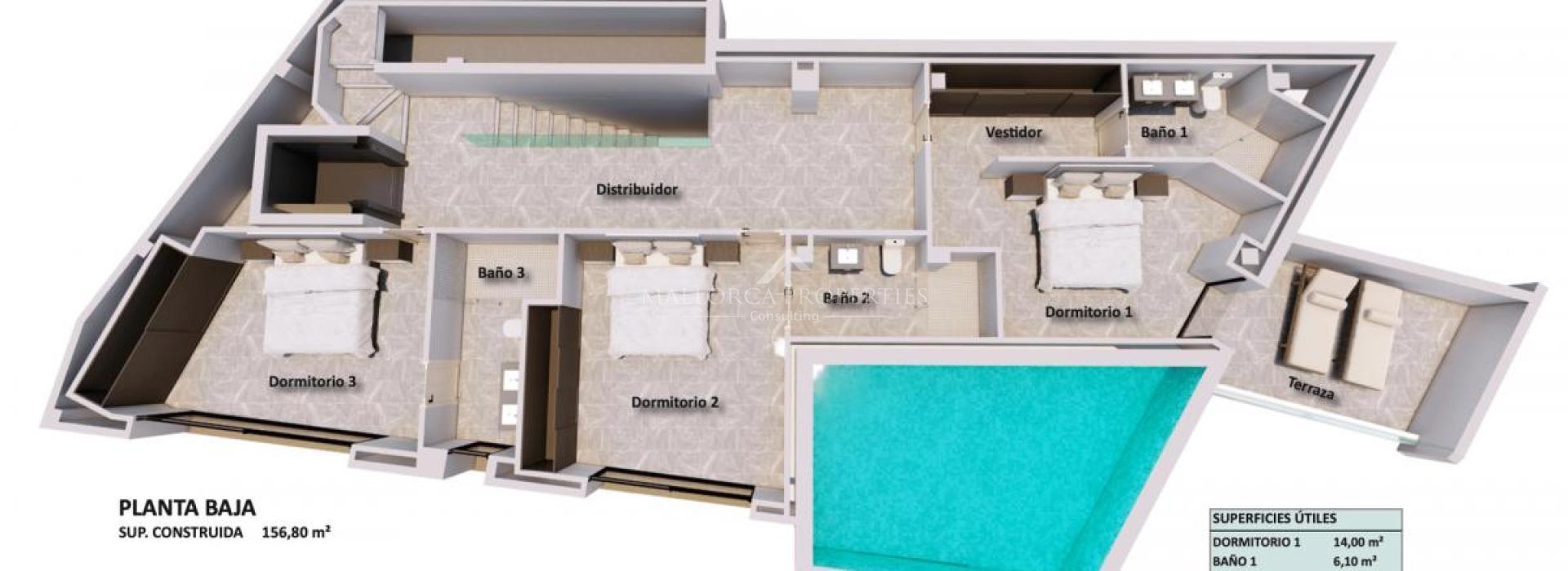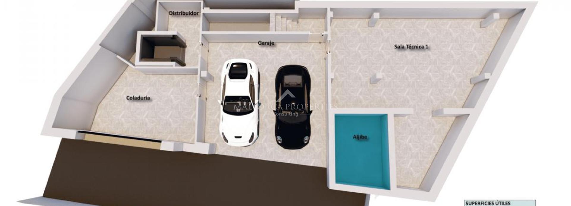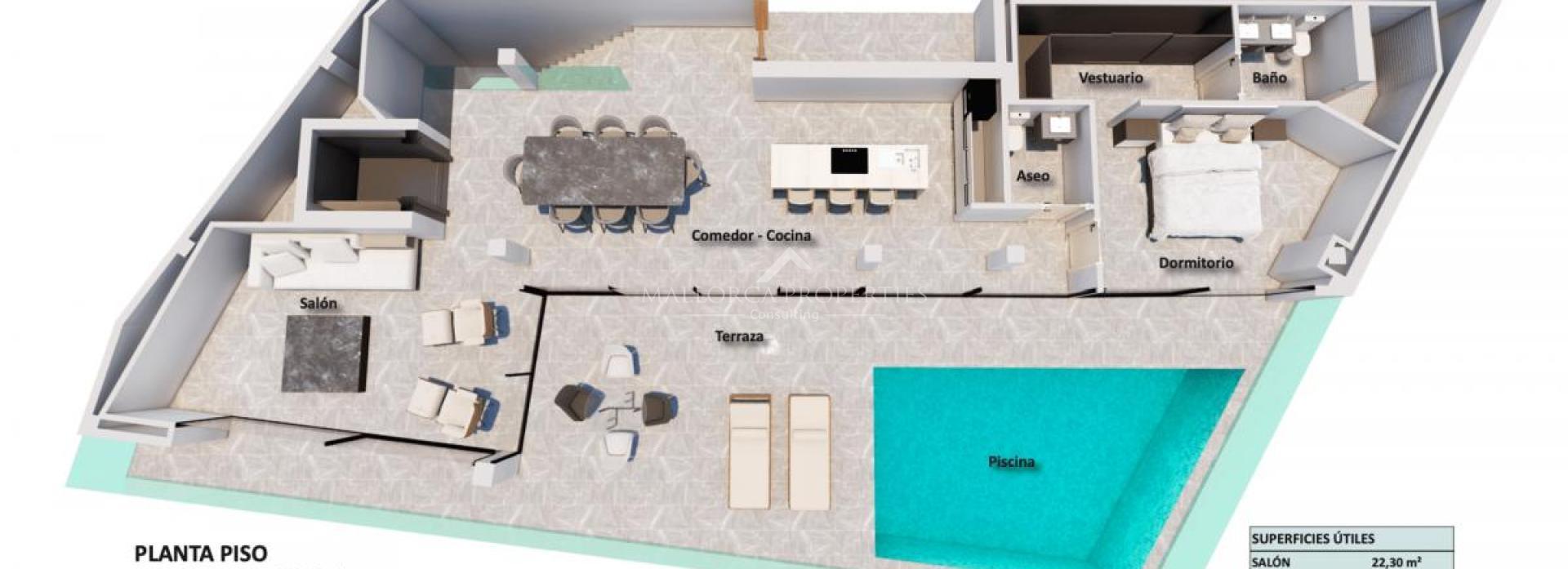 La propiedad ocupa una inmejorable ubicación en una ladera y la entrada principal se encuentra en el primer piso de la propiedad. Esto conduce a un amplio y luminoso salón-comedor y una lujosa cocina de planta abierta. En esta planta de la casa también hay un elegante dormitorio doble con baño en suite y vestidor. Hay acceso directo a la fabulosa terraza y piscina desde todas estas estancias. Fantásticas vistas al mar se pueden disfrutar desde el primer piso. La terraza soleada permite disfrutar del maravilloso clima de la isla de Mallorca.