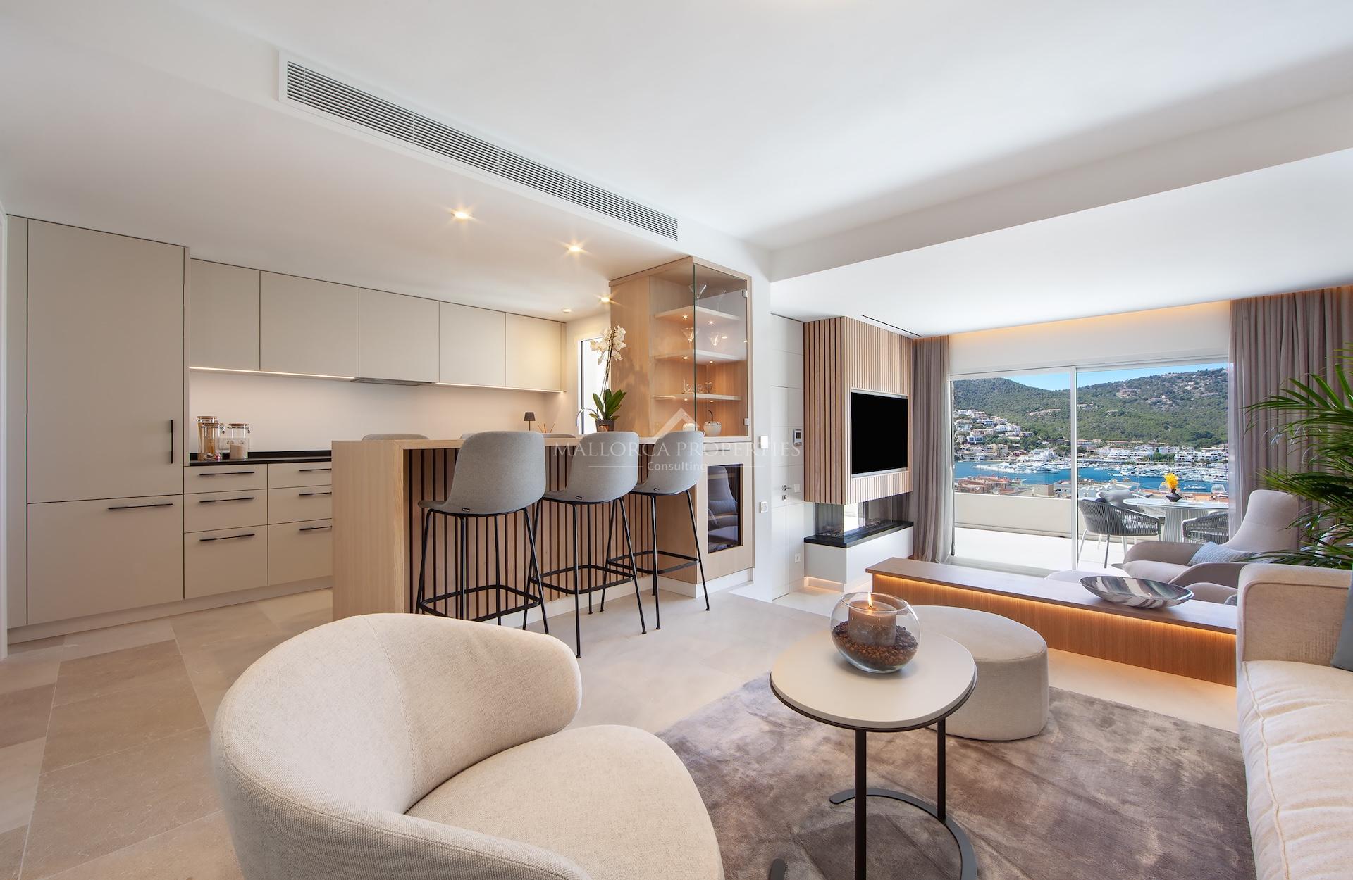 Impresionante adosado moderno que ofrece vistas espectaculares al mar, al Puerto de Andratx y a las montañas. La propiedad fue elegantemente renovada en el 2023 y se encuentra a tan solo unos pasos del encantador y pintoresco Puerto de Andratx, uno de los destinos más deseables de la isla de Mallorca. El adosado se distribuye en 3 plantas meticulosamente diseñadas, con una superficie construida total de aprox. 186 m². El espacio habitable, que abarca aprox. 123 m², ha sido completaente renovado y modernizado, combinando diseño y tecnología contemporánea con elementos tradicionales mediterráneos.