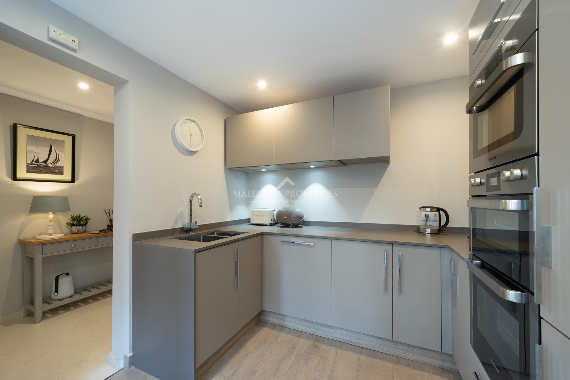 This stunning corner garden apartment is located in the highly sought-after gated community of Ses Oliveres, adjacent to the prestigious Bendinat Golf Course. The apartment offers a living area of approximately 117 m², complemented by a covered terrace of about 12 m², an open terrace of around 21 m², and a charming private garden of approximately 93 m². The property includes a spacious living-dining room with a fireplace and direct access to the outdoor spaces. The modern, fully equipped kitchen features a laundry room with a washing machine and tumble dryer. There are two elegant double bedrooms with built-in wardrobes, along with two bathrooms (one en suite with a bathtub and shower). Additional features include hot and cold air conditioning, marble floors throughout, and heated towel rails in the bathrooms. The apartment also benefits from a parking space in the underground garage. Included in the sales price is the elegant furniture.