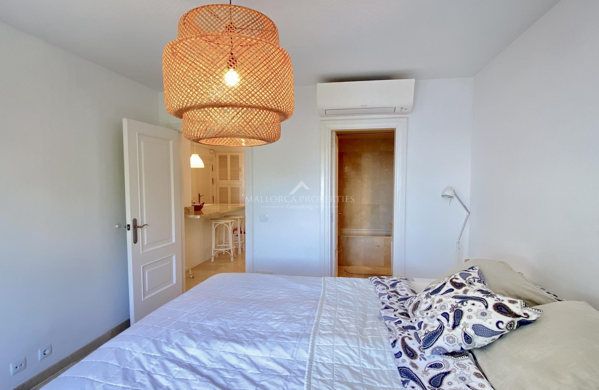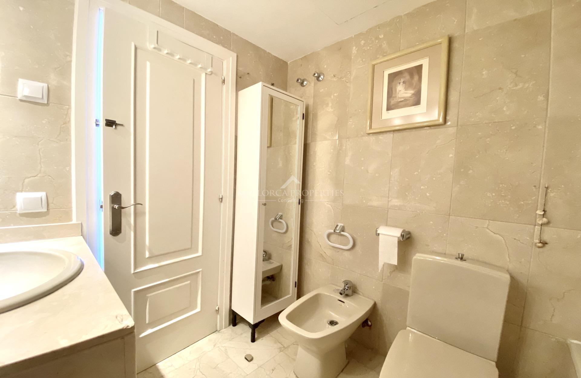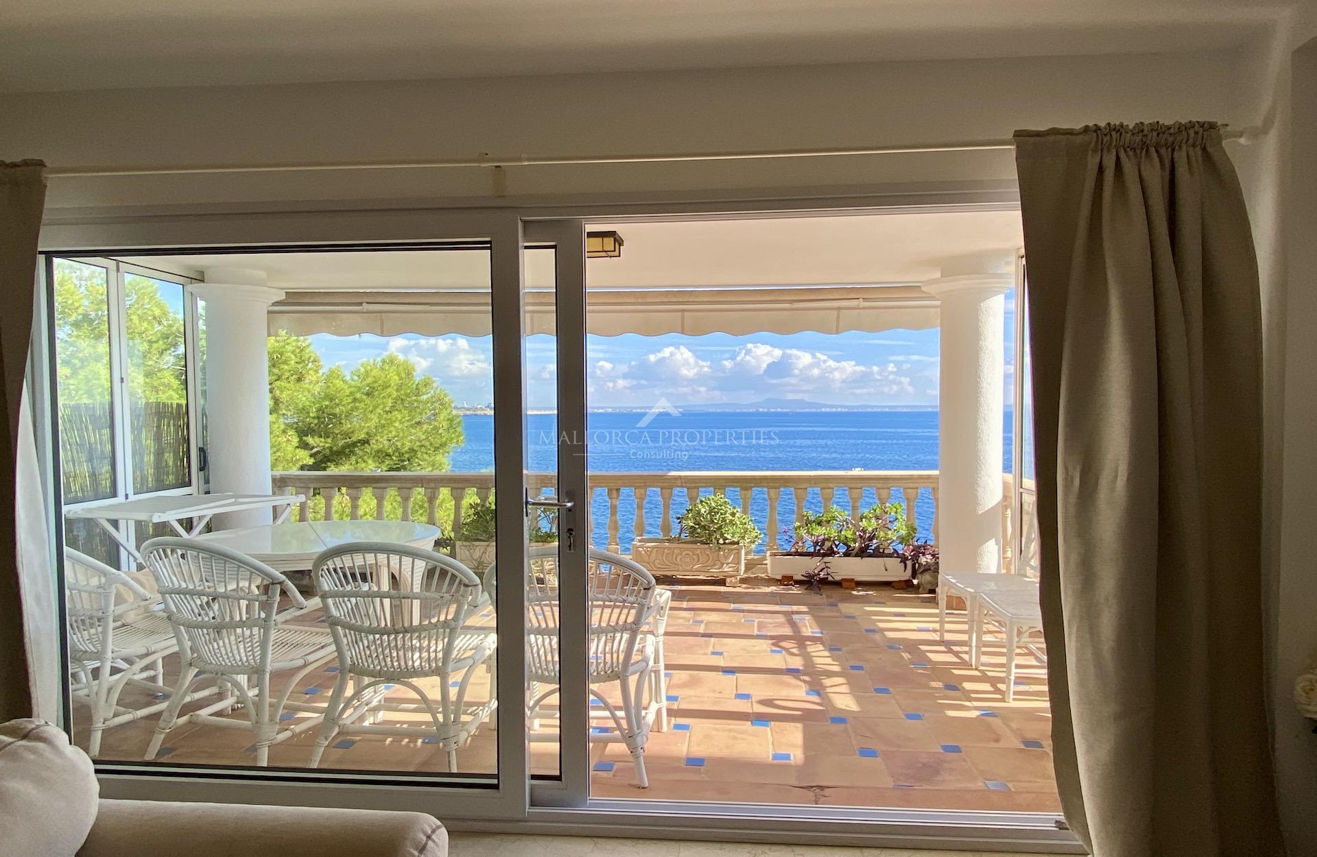 Beautiful apartment in front line to the sea in Illetas, with breathtaking views over the bay of Palma and direct access to the sea. The total constructed area of approx. 91 m² offers a living space of approx. 72 m² and is distributed as follows: 2 bedrooms, 2 bathrooms (1 en suite), bright and sunny living/dining room with fireplace and access to the terrace, renovated and equipped open-plan kitchen. The apartment benefits from air conditioning (warm/cold) and has elegant marble floors throughout. Lovely terrace of approx. 19 m² with panoramic sea views. The apartment is a part of a hotel complex featuring indoor and outdoor swimming pools and direct sea access. There is a garage parking space included and the building has a lift.