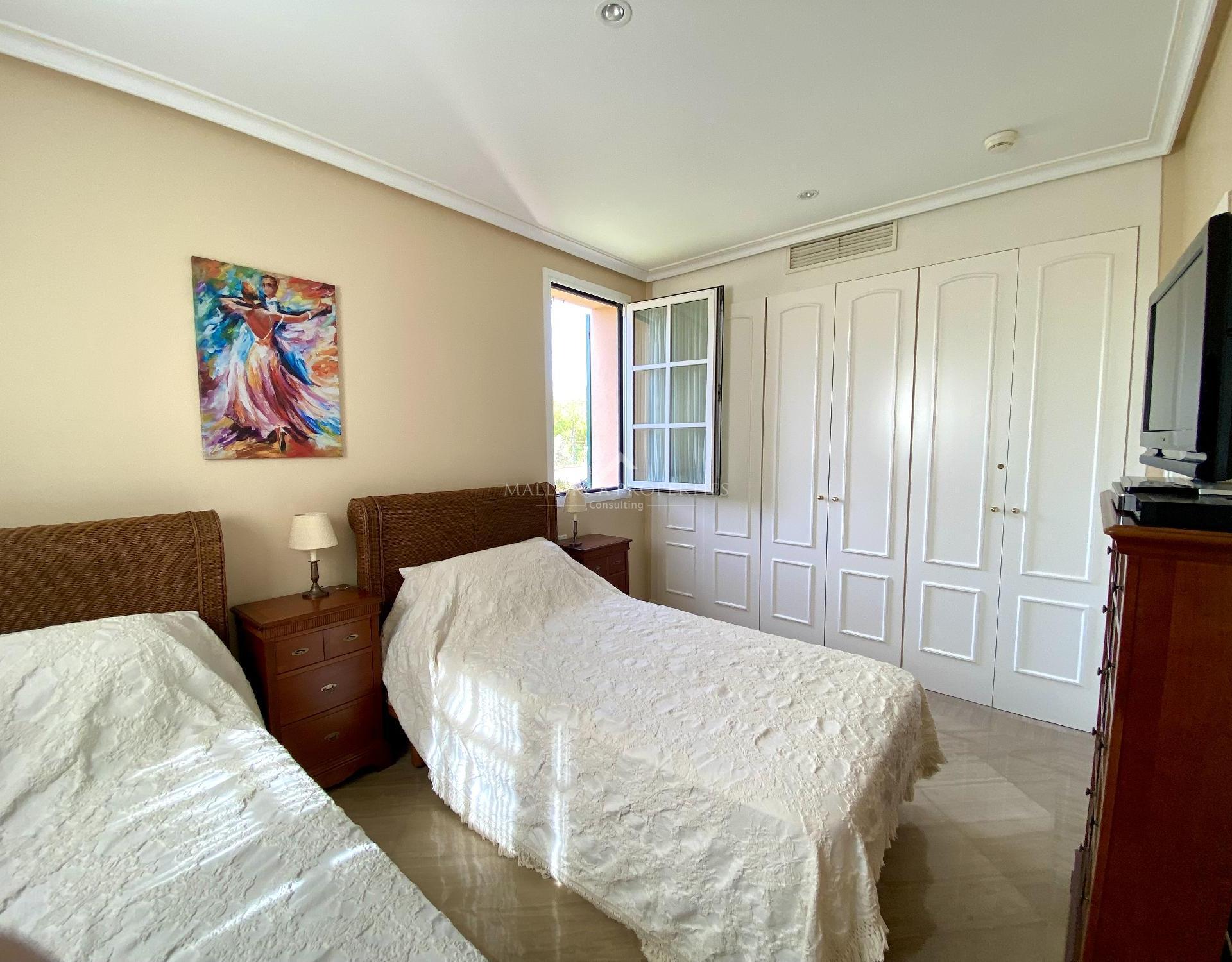 There is also a guest toilet, laundry room and garage for 1 car in the underground parking. The apartment is equipped with reversible air conditioning, marble floors and underfloor heating in the bathrooms. This luxury development offers as well a 24 hours security service and concierge.