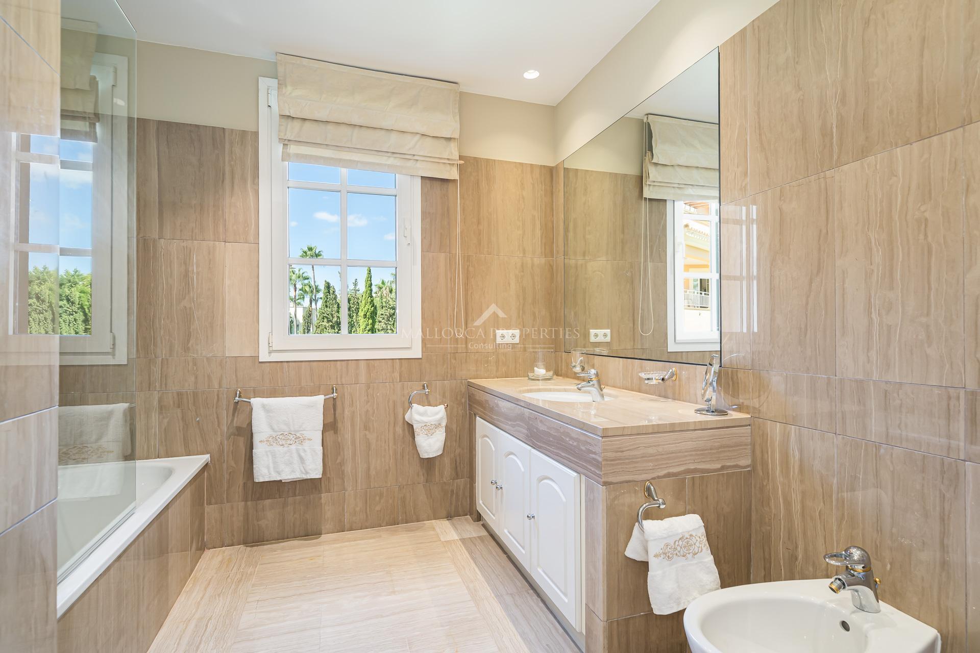 This stylish apartment offers an extremely spacious living area of approximately 284 m², which includes the covered terrace of approximately 50 m². It comprises a large entrance hall leading to a bright and spacious living-dining room with access to this beautiful terrace. The generously sized modern kitchen is separate from the living area and is totally renovated and fully equipped. An ample laundry room leads off the kitchen. The property features 3 tasteful double bedrooms, all benefitting from en suite bathrooms and fitted wardrobes. Separate guest toilet.